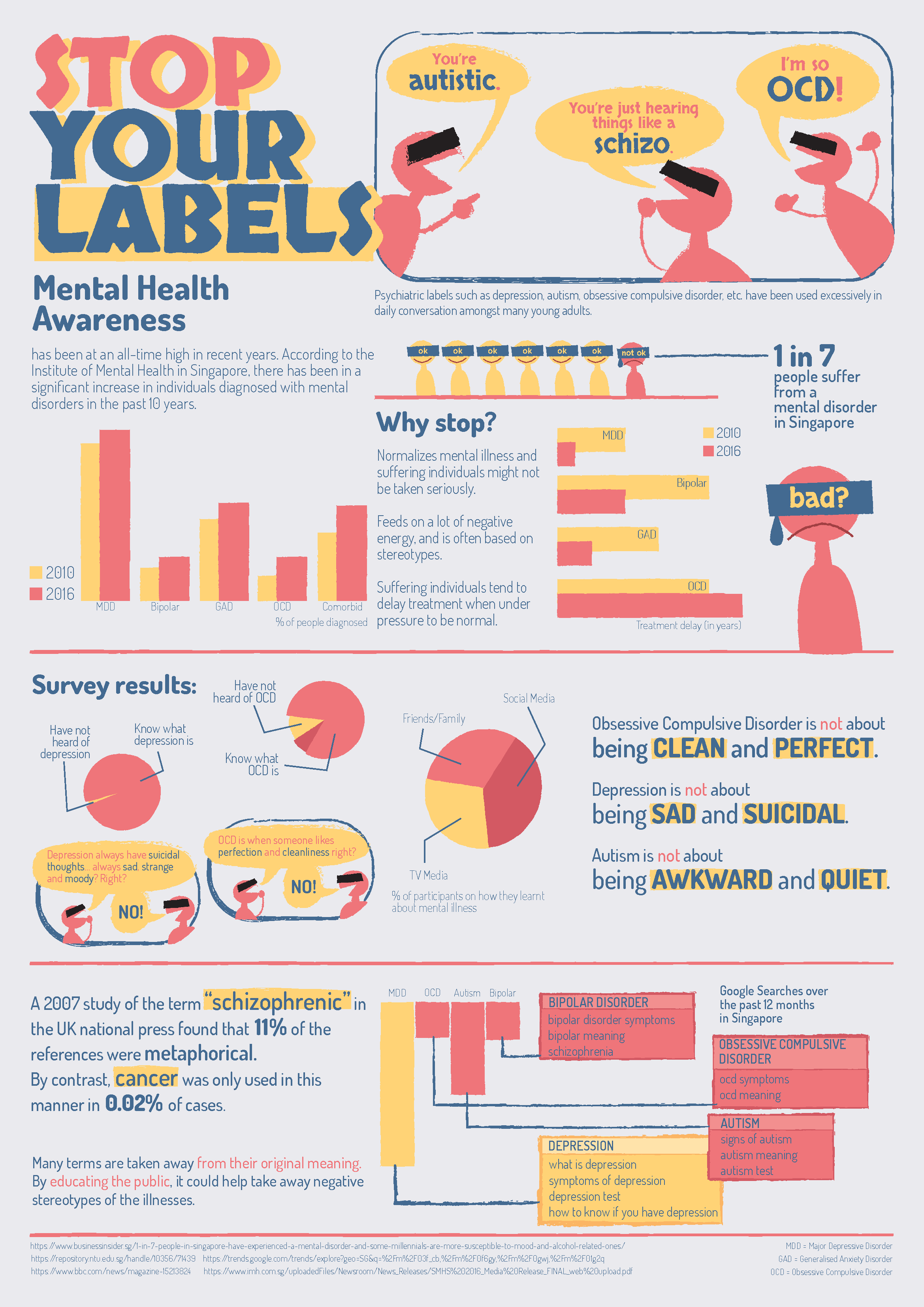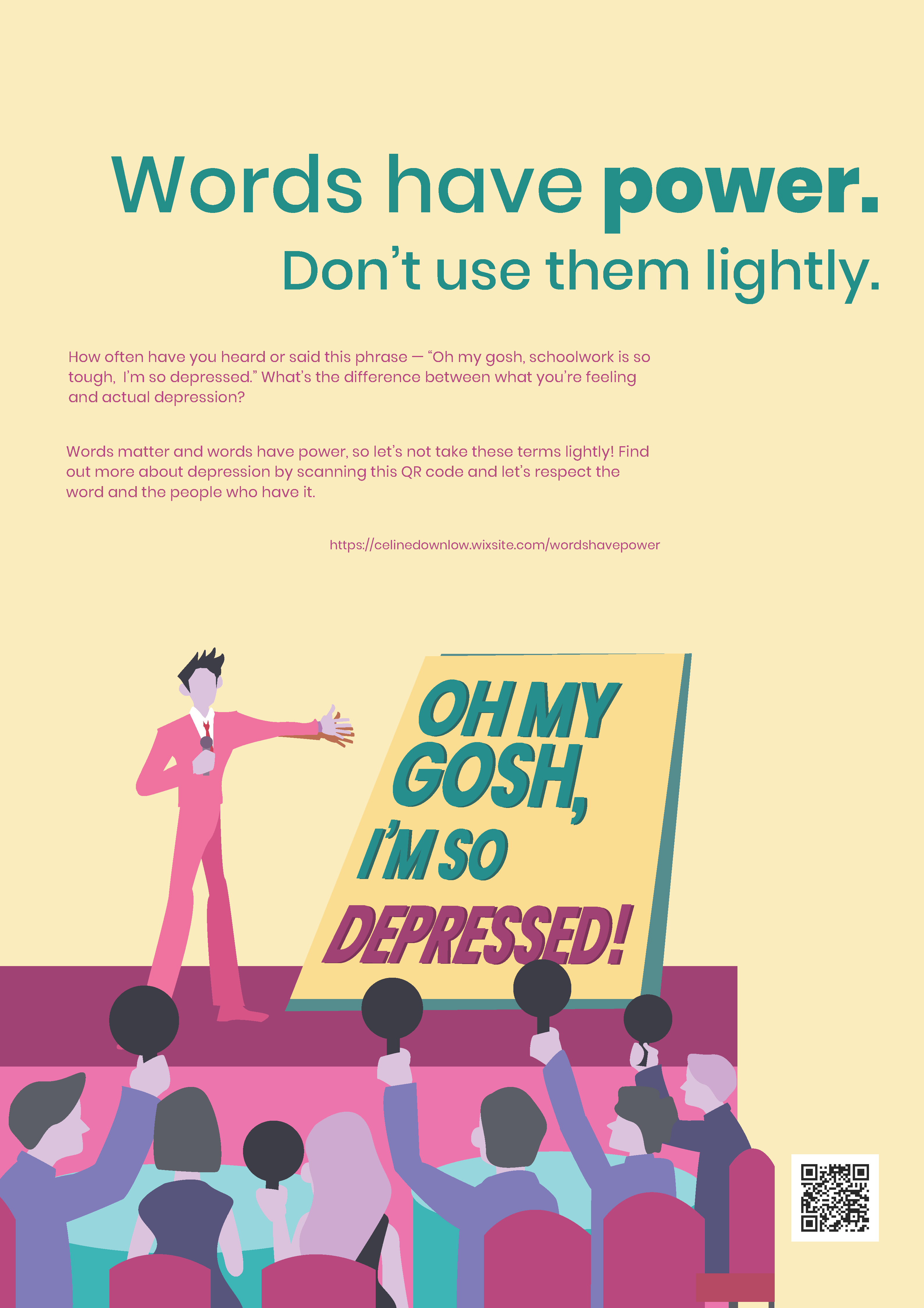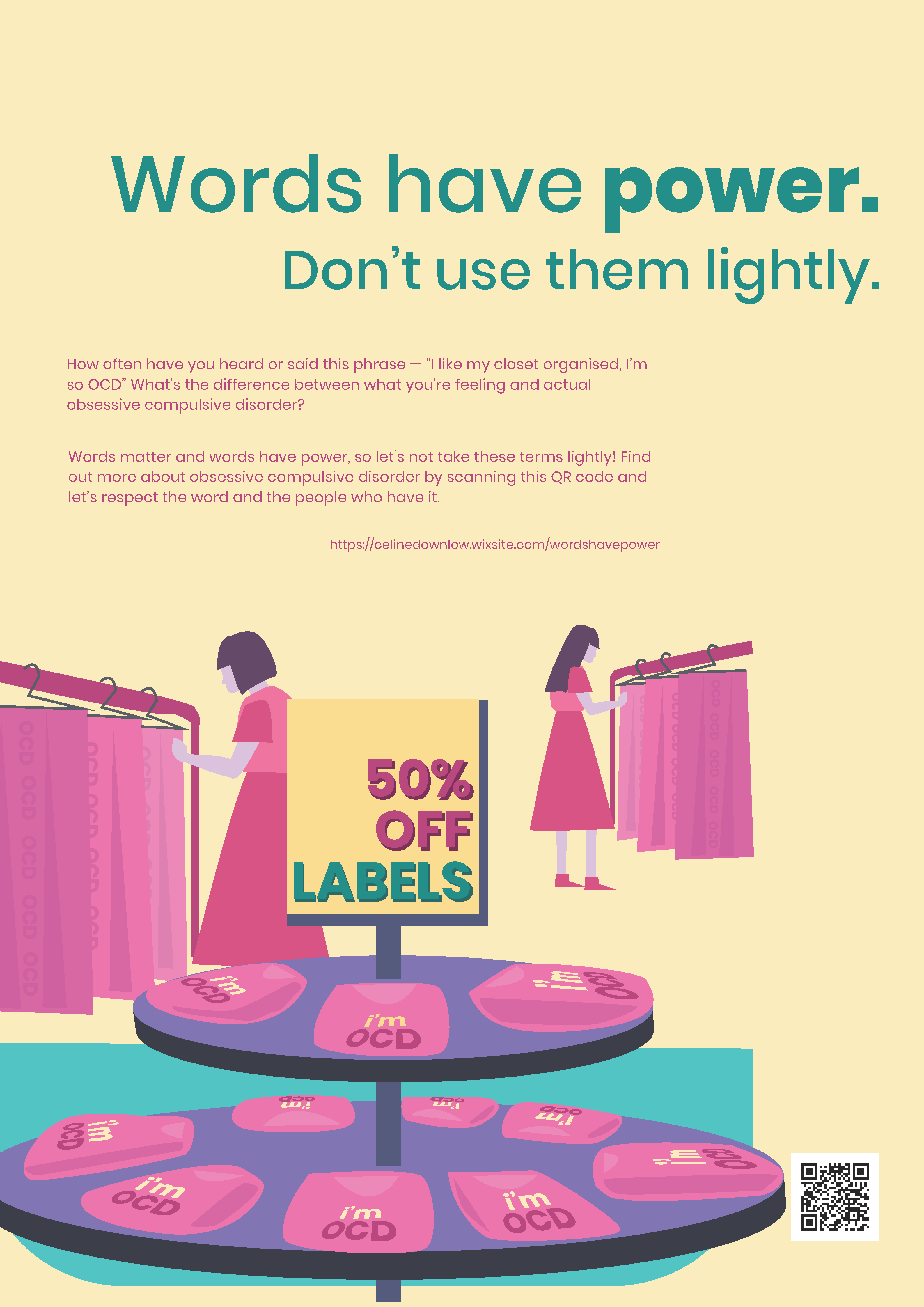 Words like "I'm so OCD!" are actually way more harmful than you think. Words Have Power is a project about bringing awareness to using mental health terms in your daily life. The use of posters is to encourage the misuse of these terms loosely, keeping these mental health terms from losing the seriousness in their meaning. A website, linked via available QR codes on the posters, allows the audience to learn more about the project on a whole and explains these mental health terms and their true symptoms.