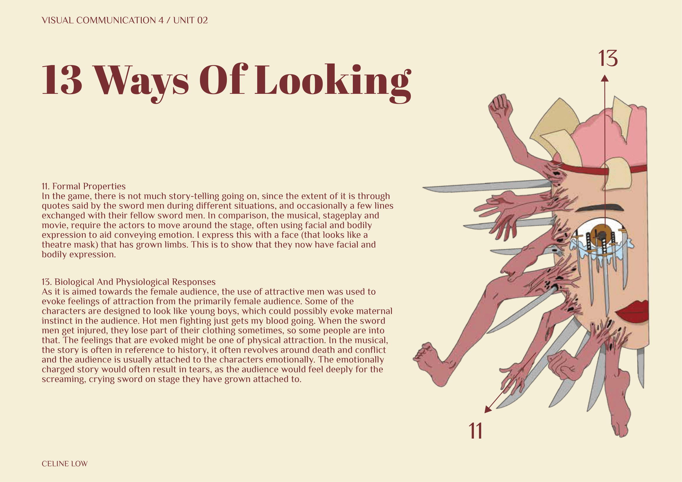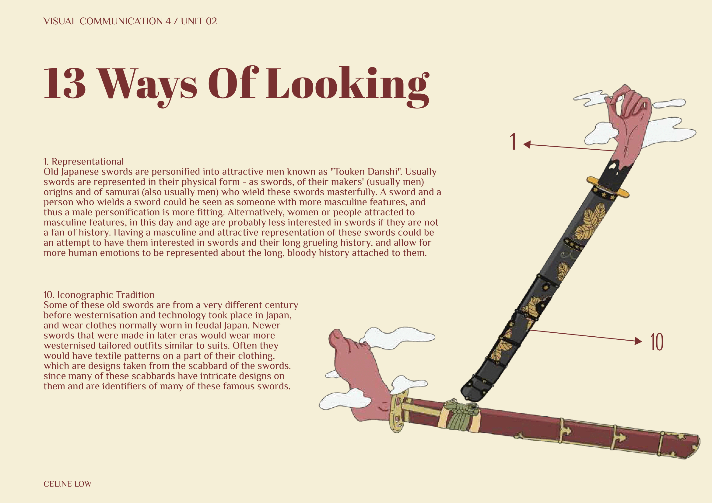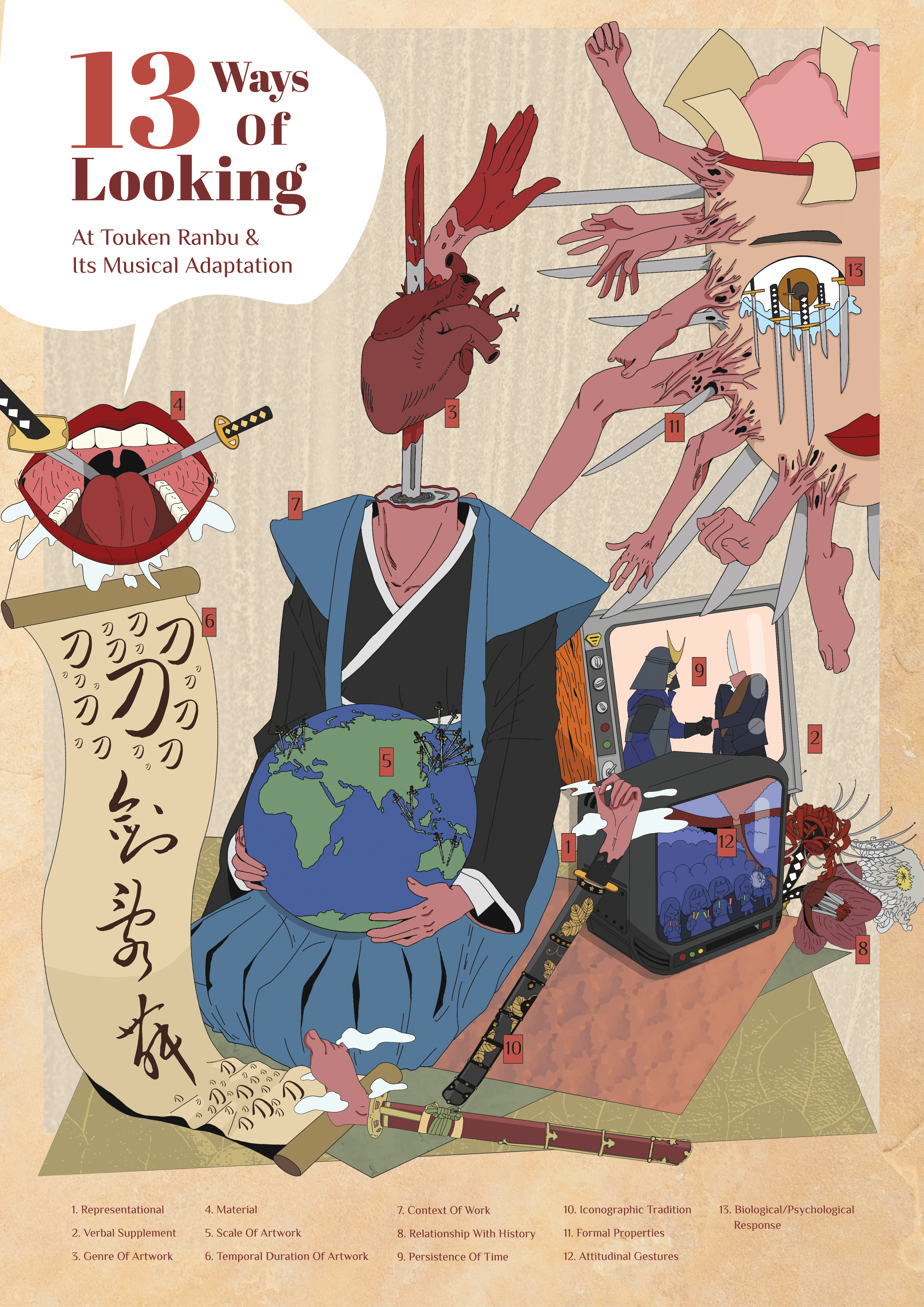 A school project about finding different ways to look at a piece of media one likes, based on the poem Thirteen Ways Of Looking At A Blackbird by Wallace Stevens. I chose the musical adaptation of Touken Ranbu to look at. By researching the series of choice and using the 13 different ways, we were to explain the various ways to look at it (representational, verbal supplement, scale of artwork, etc.) I then took different elements and made separate illustrations to represent parts of Touken Ranbu: The Musical.