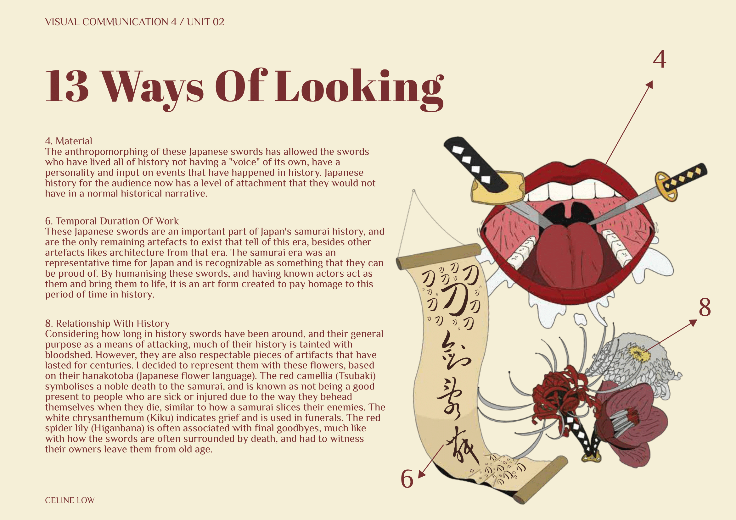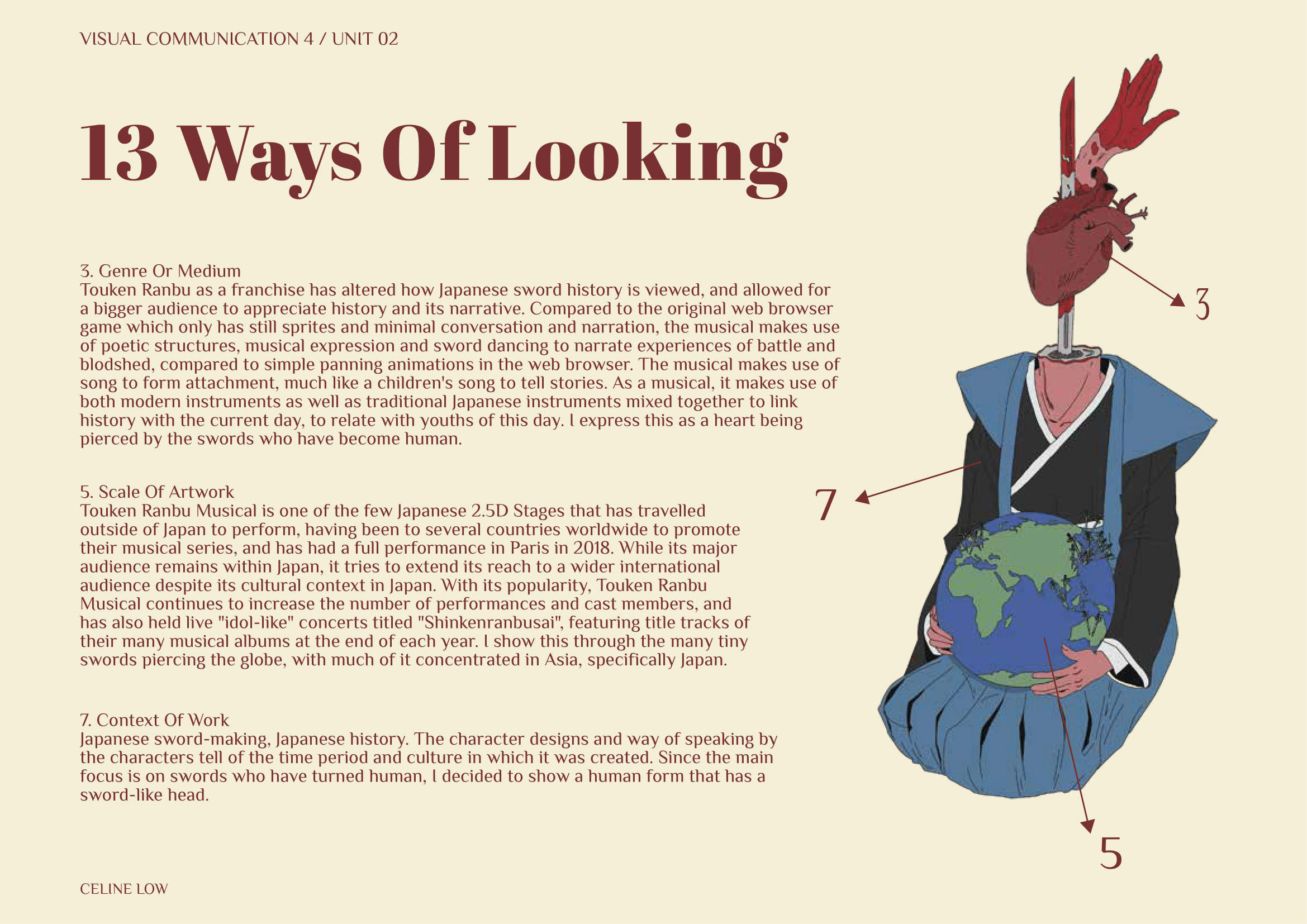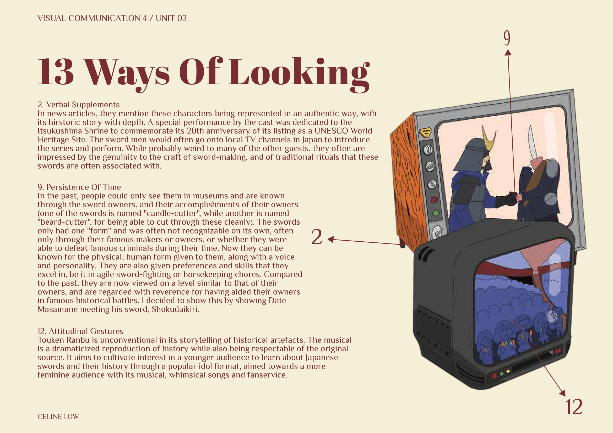 A school project about finding different ways to look at a piece of media one likes, based on the poem Thirteen Ways Of Looking At A Blackbird by Wallace Stevens. I chose the musical adaptation of Touken Ranbu to look at. By researching the series of choice and using the 13 different ways, we were to explain the various ways to look at it (representational, verbal supplement, scale of artwork, etc.) I then took different elements and made separate illustrations to represent parts of Touken Ranbu: The Musical.