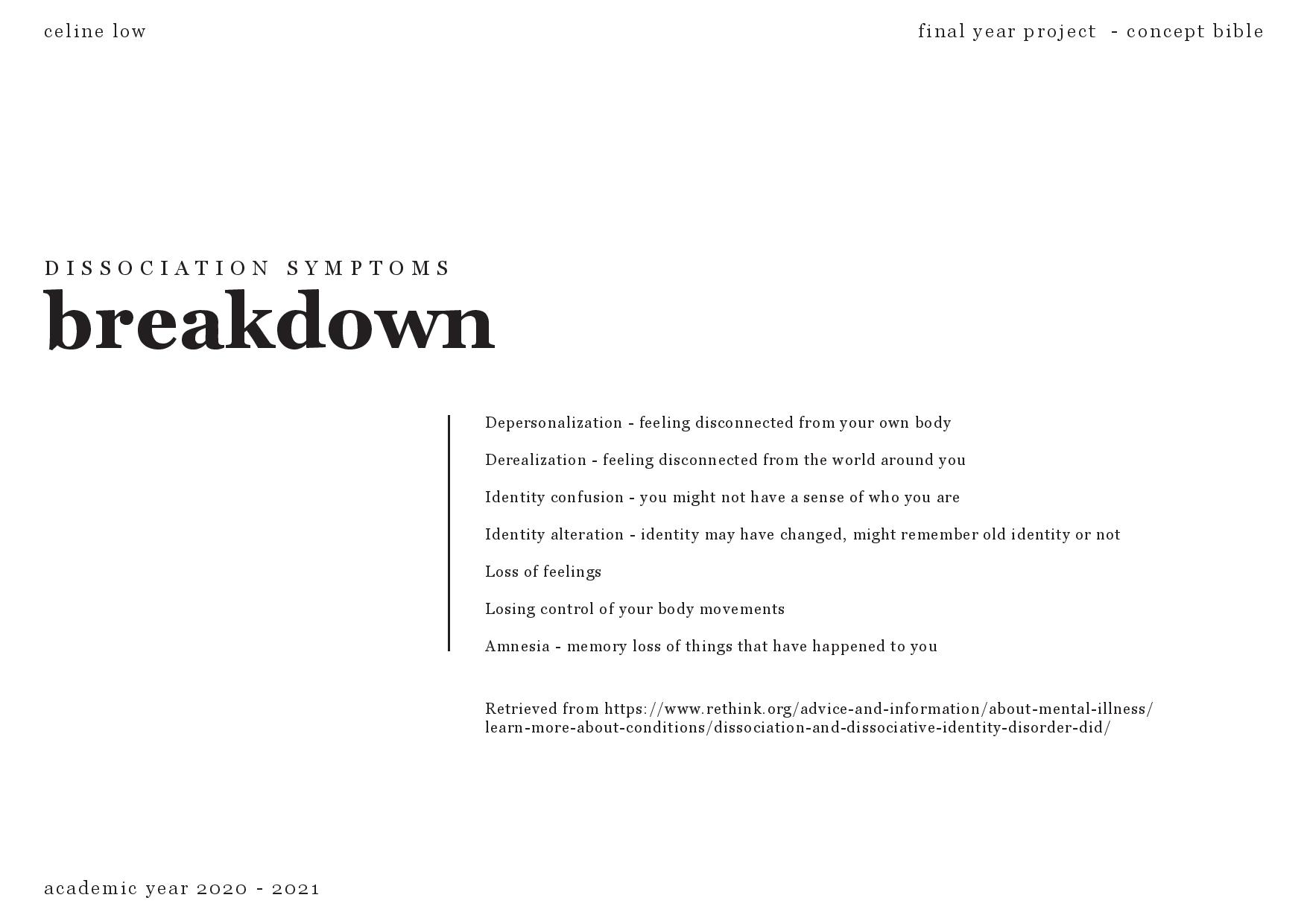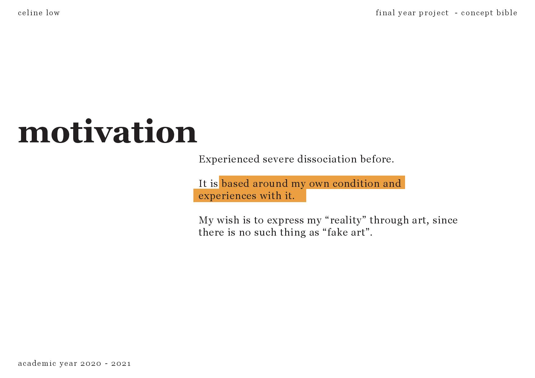 While it does not actively take on the role of an educational art piece, Undentity serves as a platform for others to understand dissociation and dissociative identity disorder – symptoms such as not feeling connected to one’s own body and feelings of taking on different identities. By projecting these dissociative emotions onto an audience, the participants will get a sense of what it is like to experience dissociation daily.At the same time, it the project serves as a model of support for others with similar experiences, to embrace their condition and to encourage them to use art as a means of self-soothing during bad mental health episodes, as I have done throughout this project.