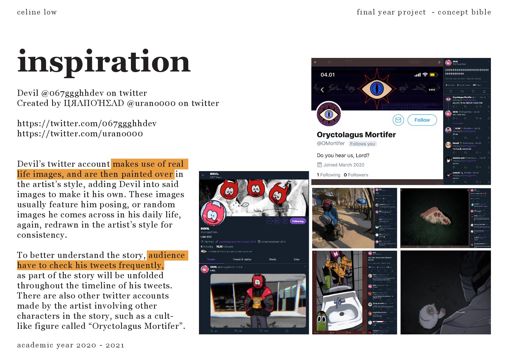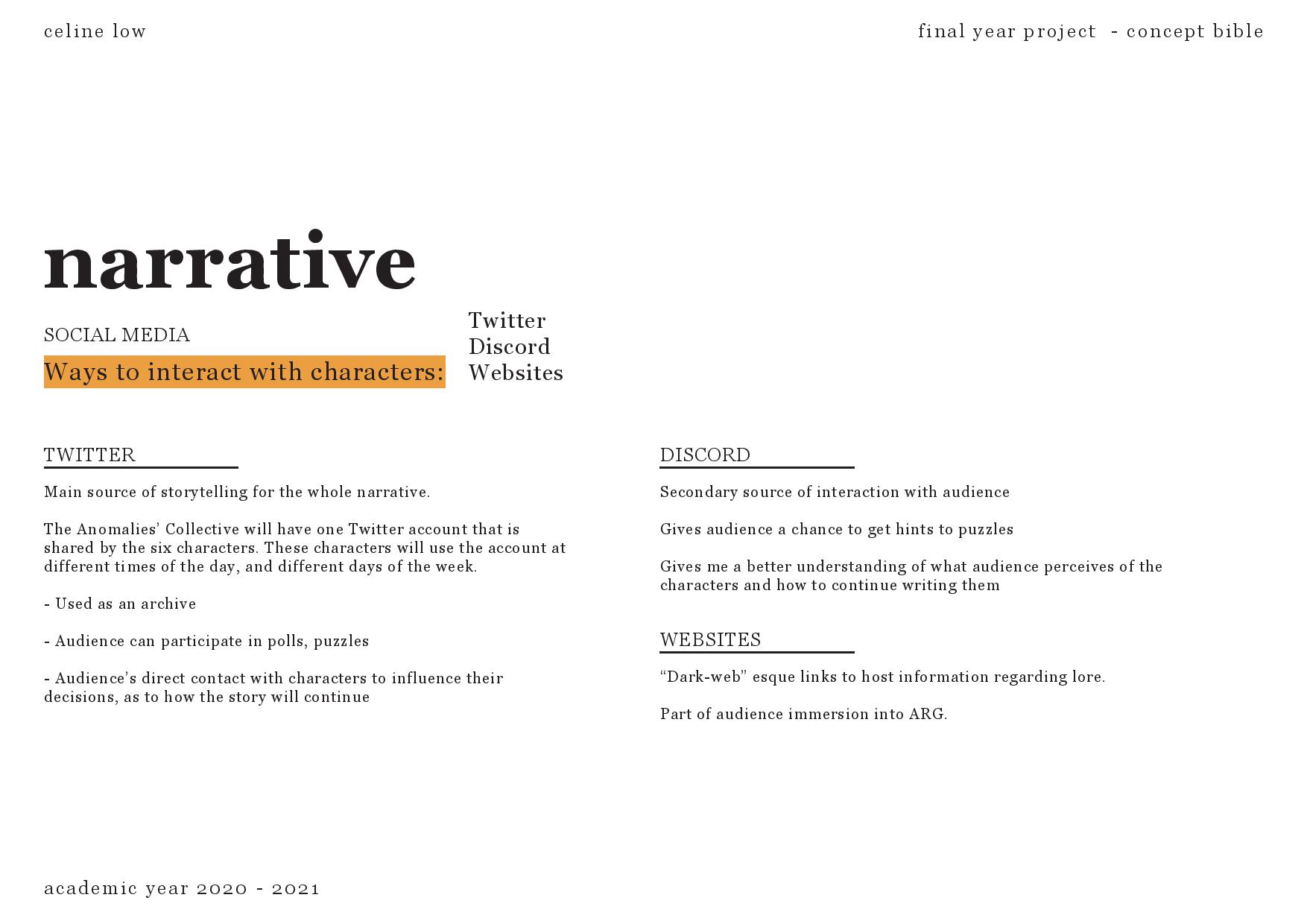 My decided source of social media to work on was Twitter. I decided to go with Twitter because I have been interested in an alternate way of storytelling and world-building through social media. Since everyone now uses social media, we rarely see the other person, particularly if we're conversing with strangers. For example, someone can use a fake identity and roleplay as a cute girl to catfish people. There is a blur between reality and virtual reality, and having fictional virtual characters emulates that feeling where they might or might not exist. The Twitter accounts are handled by the fictional characters as a form of experimental storytelling, in which the audience interacts with the characters I have developed. It requires and relies on the audience to constantly interact and gain new information about the world. They then fit various puzzle pieces of information together to form a bigger, more coherent narrative. The ability to constantly evolve this project is an experimental part of the whole process. The audience's interaction is often unpredictable and will rely on my own ad-lib skills for the narrative to proceed.