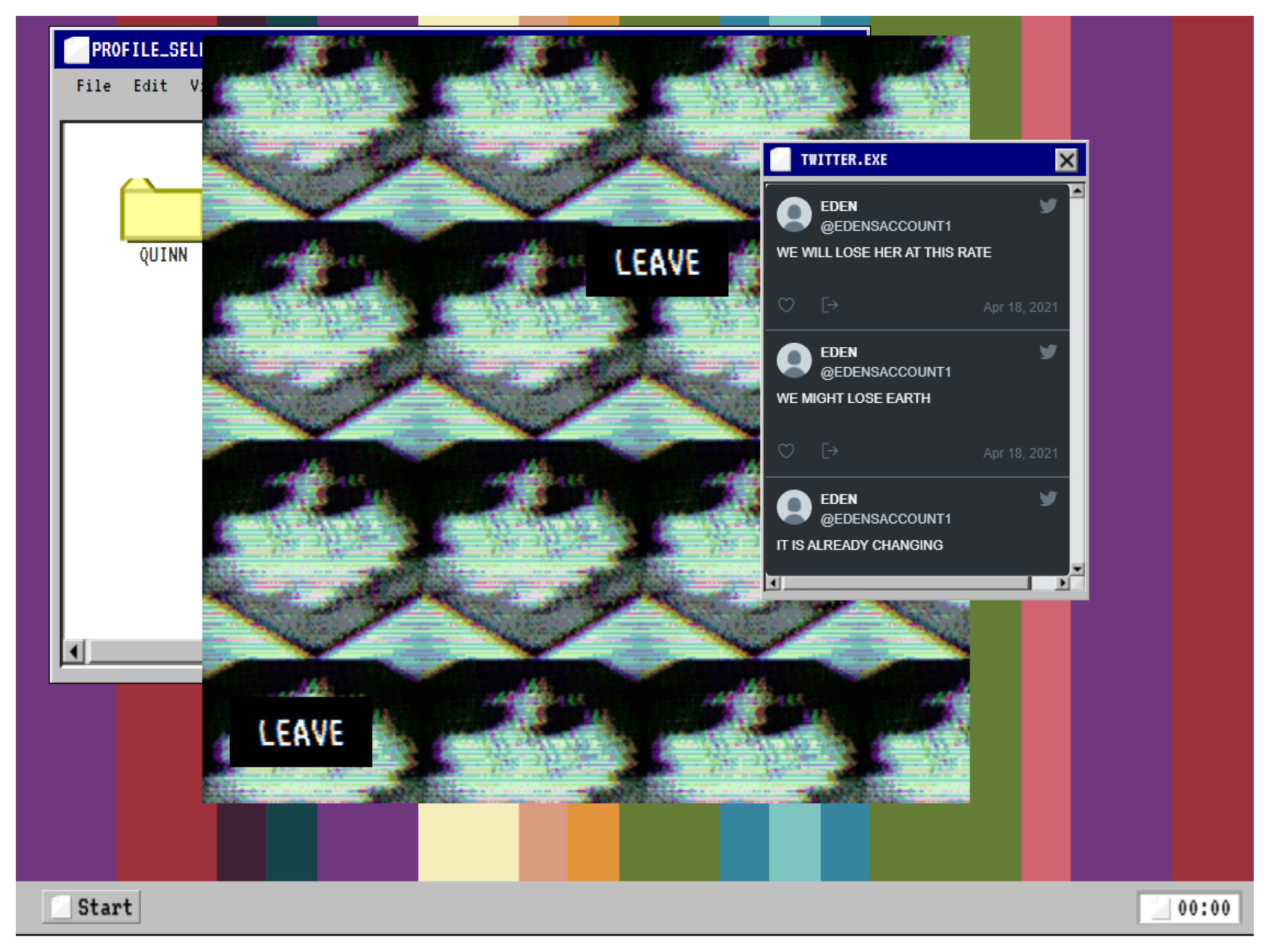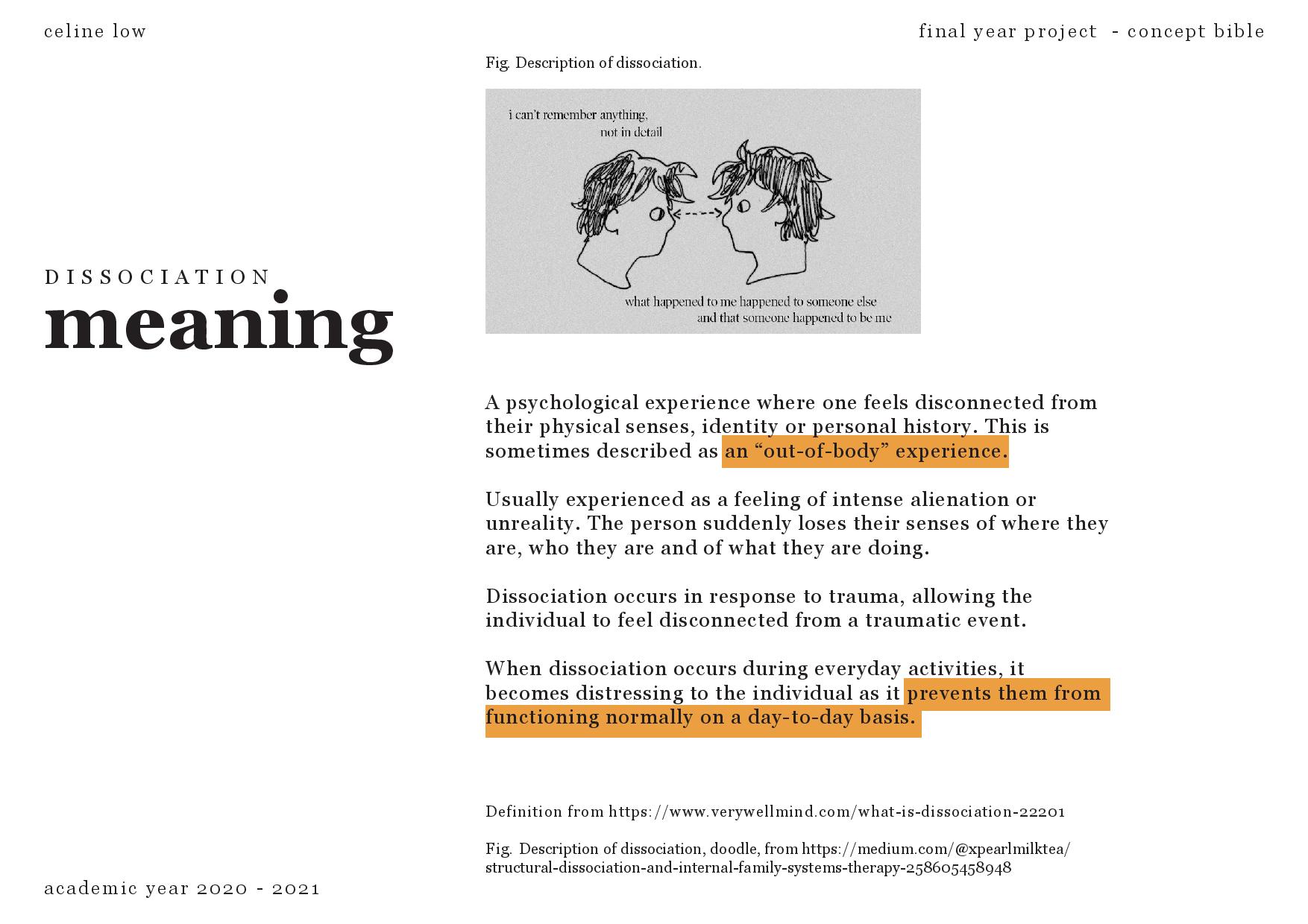The project takes on the form of an alternate reality game. A narrative that exists on the internet is based around my accumulative experience with dissociation. The project requires an audience to piece together a story by finding out about a fictional, alternate world and by relying on observational sentences made on Twitter (now known as X) by characters.